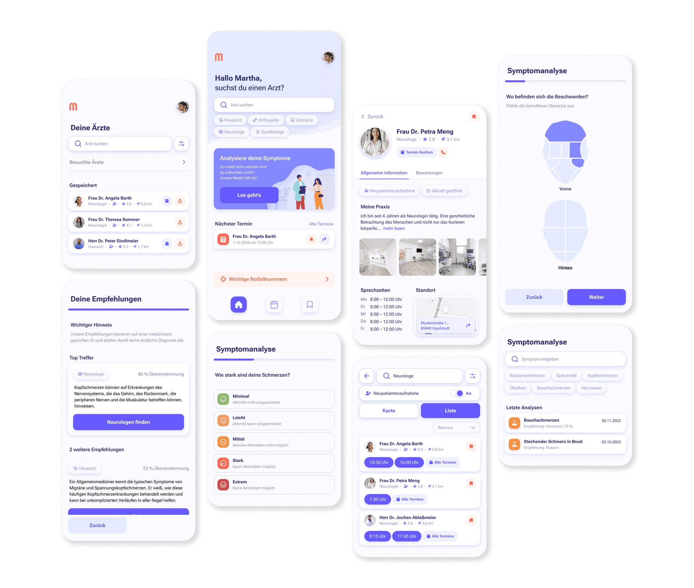 Nach einem intensiven Ideenprozess haben wir uns auf ein Problem im Gesundheitsbereich entschieden - die zeitaufwendige und oft unübersichtliche Suche nach einem passenden Arzt. Daraus entstand die Idee für Medfinder, eine mobile App, die dabei unterstützt, schnell und gezielt medizinische Hilfe zu finden. Ein zentrales Feature ist die KI-basierte Symptomanalyse, mit der passende Fachärzte basierend auf Beschwerden vorgeschlagen werden.